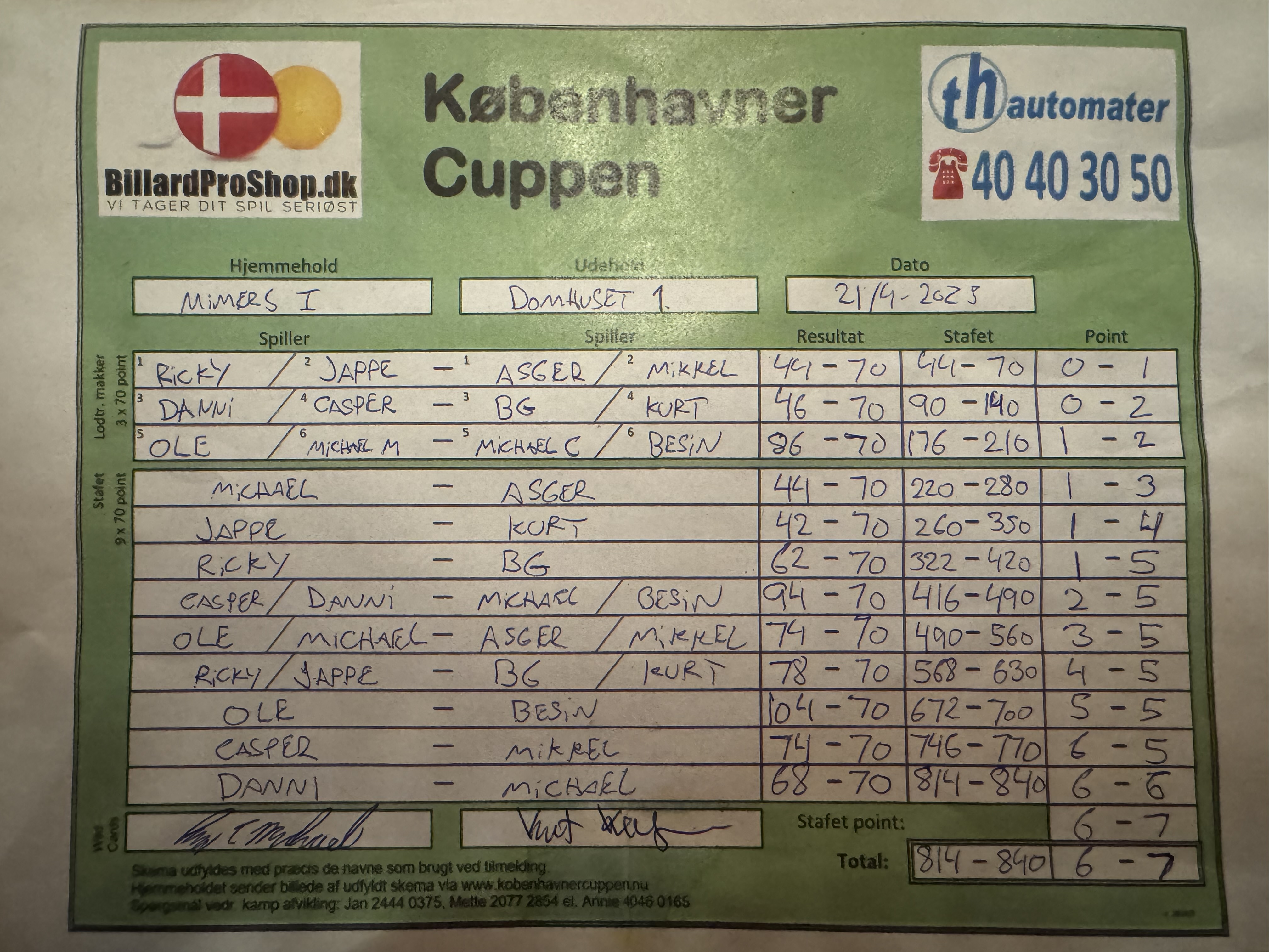 | Hold | Stafet | Point |